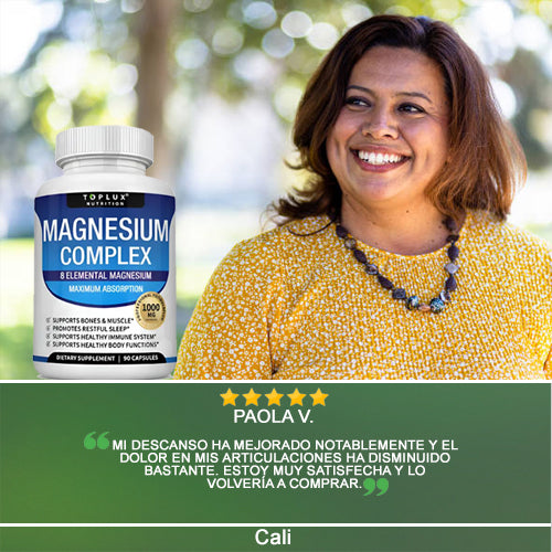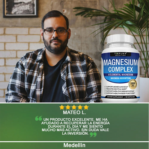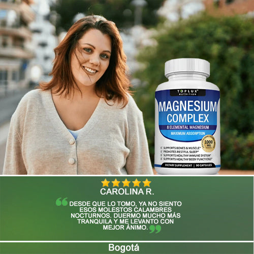 Magnesium Complex premium con 8 tipos de magnesio altamente biodisponibles en cápsulas softgel líquidas para mejor absorción. Ayuda al sueño profundo, energía natural, reducción del estrés y recuperación muscular. Fórmula avanzada de 1000 mg por porción, 100 softgels y registro INVIMA.
